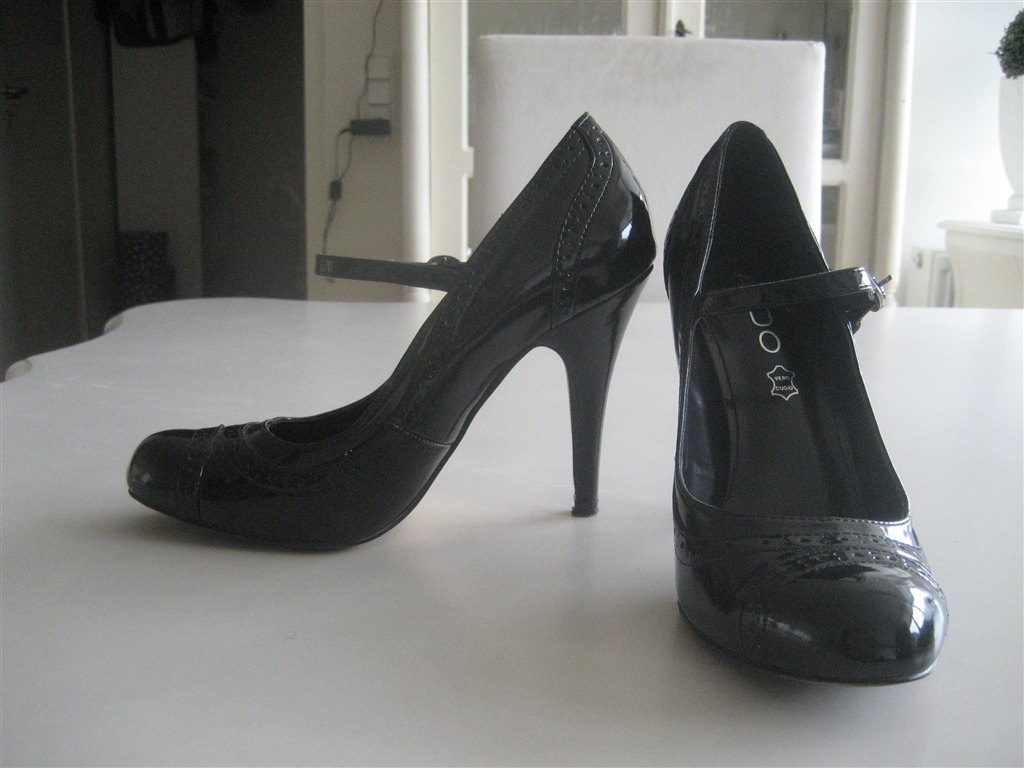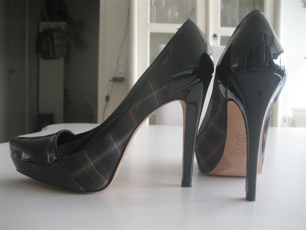 Billede 1: ALDO. Str. 36. NYPRIS 899,- DIN PRIS 350,- Smukke elegante stiletter, med sort lak snude og klassisk svagt "ternet" stof. Brugt få gange, og fremstår derfor som nye. Hæl 11,5 cm og lille platou sål foran på 3 cm. så stiletten er behagelig at gå i.