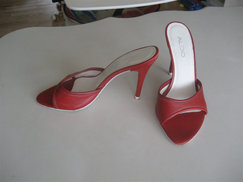 Billede 3: ALDO. Str. 36. NYPRIS 499,- DIN PRIS 150,- Røde dristige stiletter/slippers. 10 cm. hæl. Der er en lille smule slitage, men er meget meget fin stand.