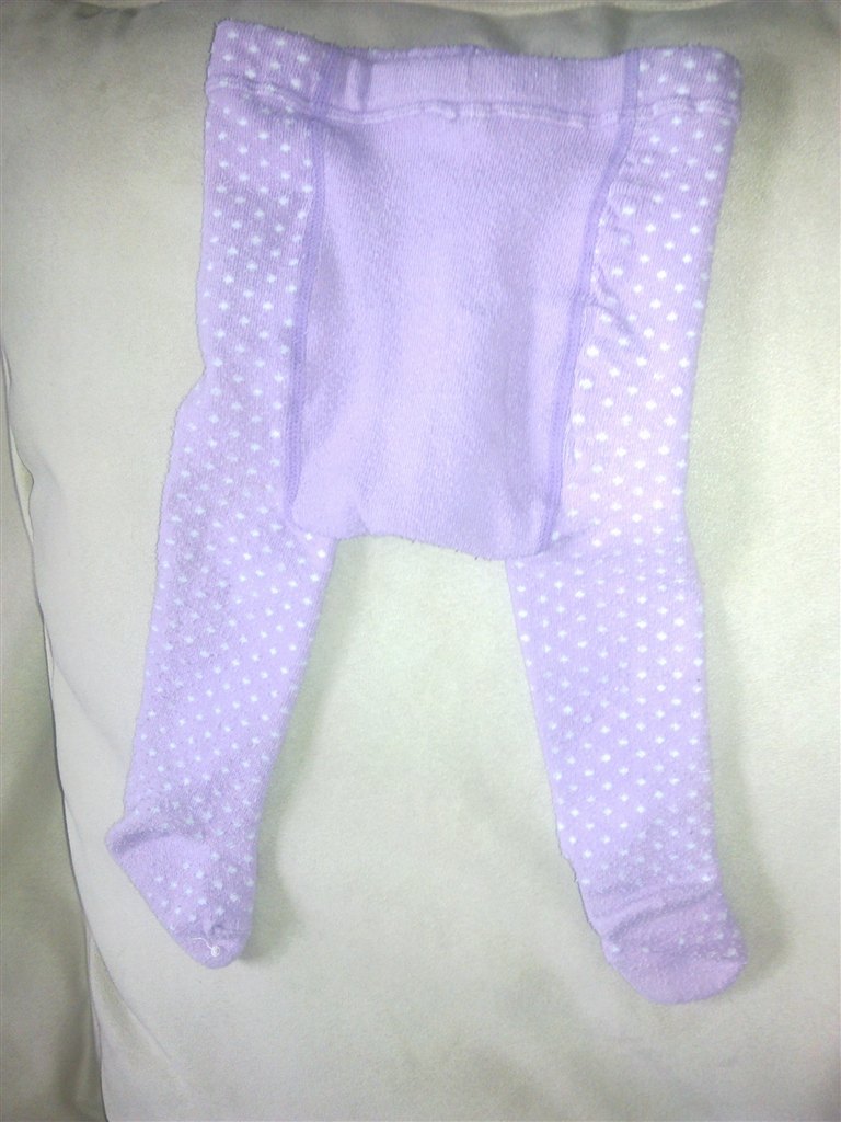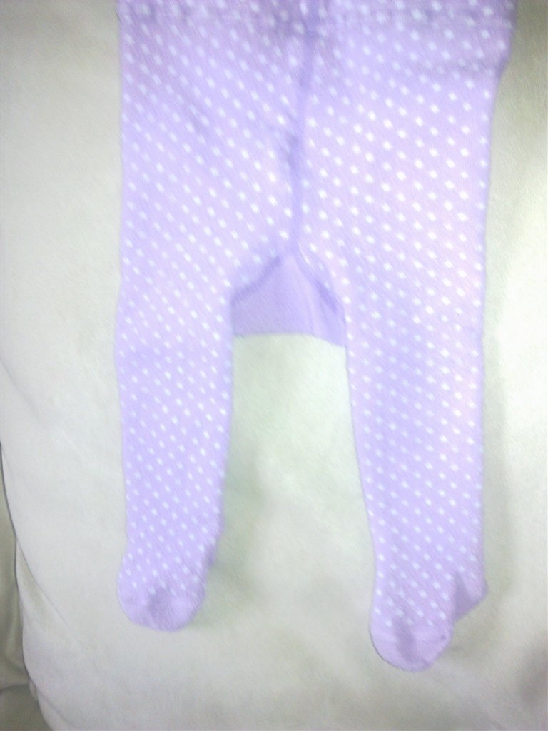 Strømpebukser fra H&M, lilla med hvide pletter, godt brugt, ingen huller eller pletter men en del vaskefnuller derfor kun 5 kr. STR 62-68