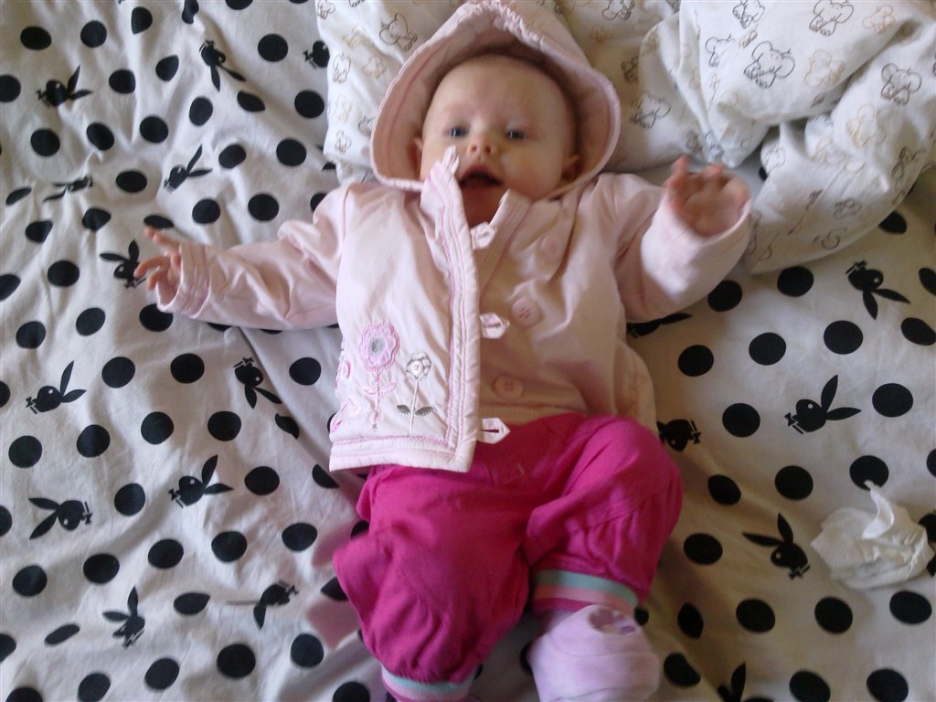 NY forårs/efterårsjakke fra babaluno str 62-68, knaplukning, blomstermotiv for og bag, kun prøvet på for at tage billederne (havde en anden jakke hun brugte) priside 60.-