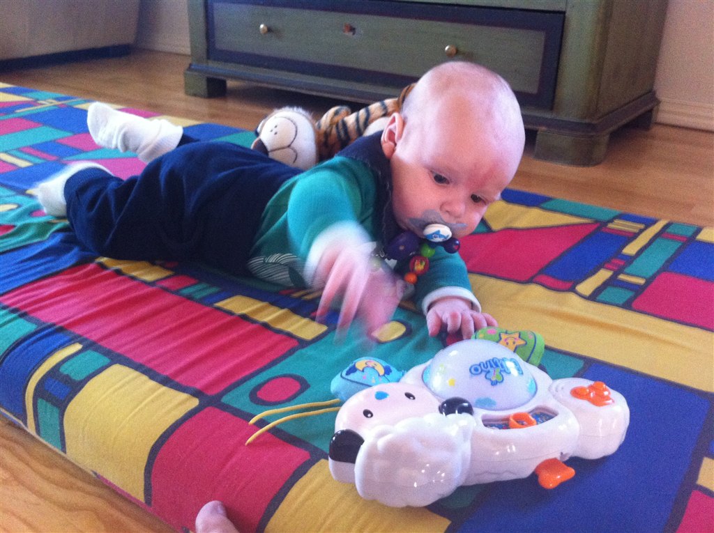 Han kan allederede både rulle fra mave til ryg og tilbage igen, Men foretrækker at ligge på maven, Men hvorfor?