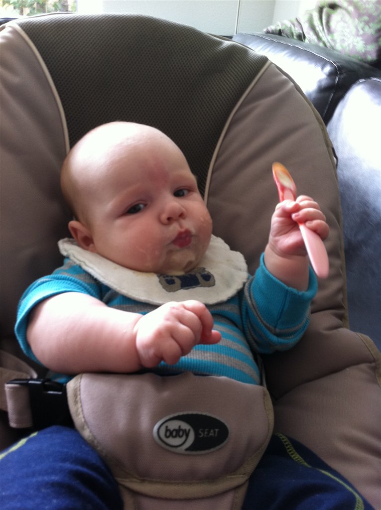 Jeg ammer, men er lige begyndt, at prøve at give lidt grød, og han Elsker det!