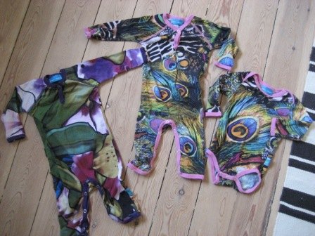 Flotte heldragte med liljer eller påfugle mønster. Samt body også med påfugle mønster.