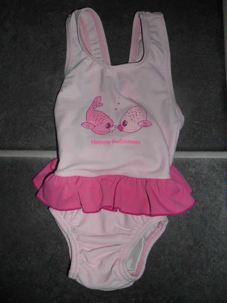 billede 1 : Exotic kids badedragt - lyserød med fisk - med flæse og sløjfe bagpå str. 60 cm.
