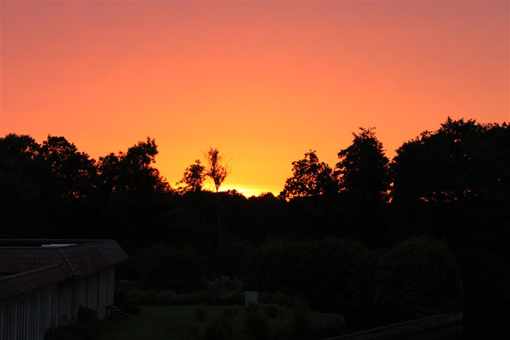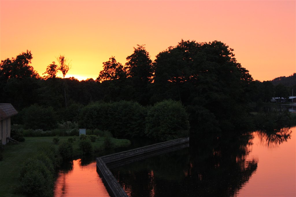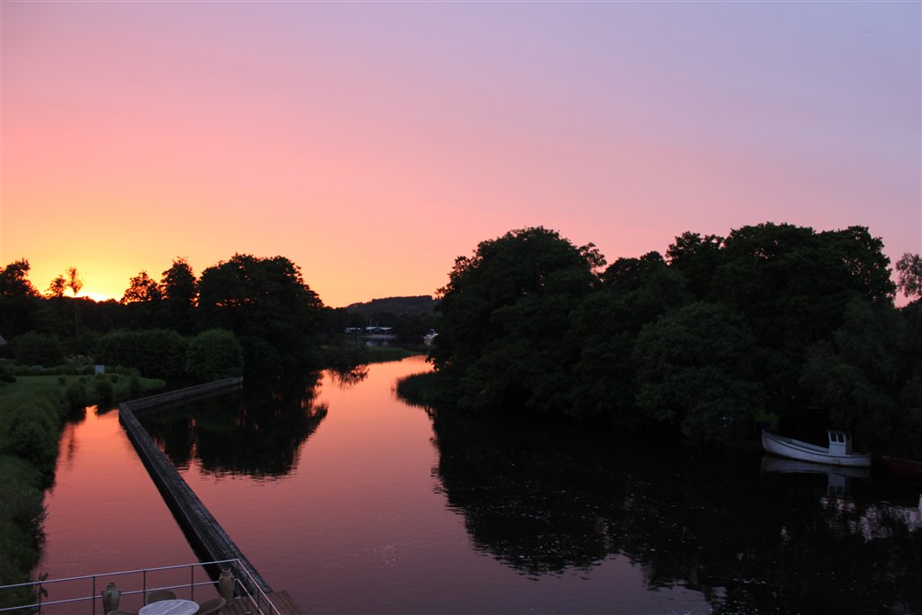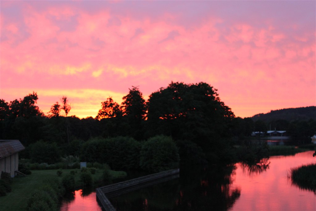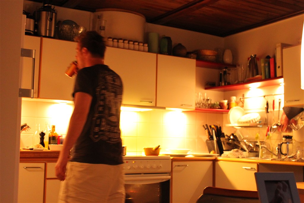 ) og nyder vedlagte solnedgang, mens manden er i køkkenet og laver aftensmad.