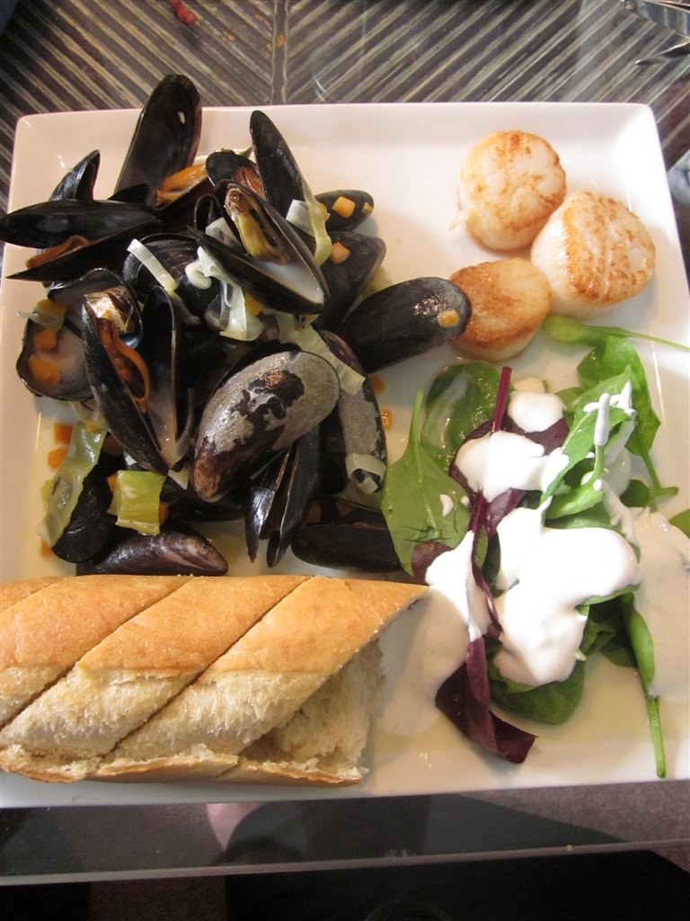 Hvidvinsdampede muslinger med flødelage til dybbelse, tre kam-muslinger salat, hjemmelavet dressing og hvidløgsflute