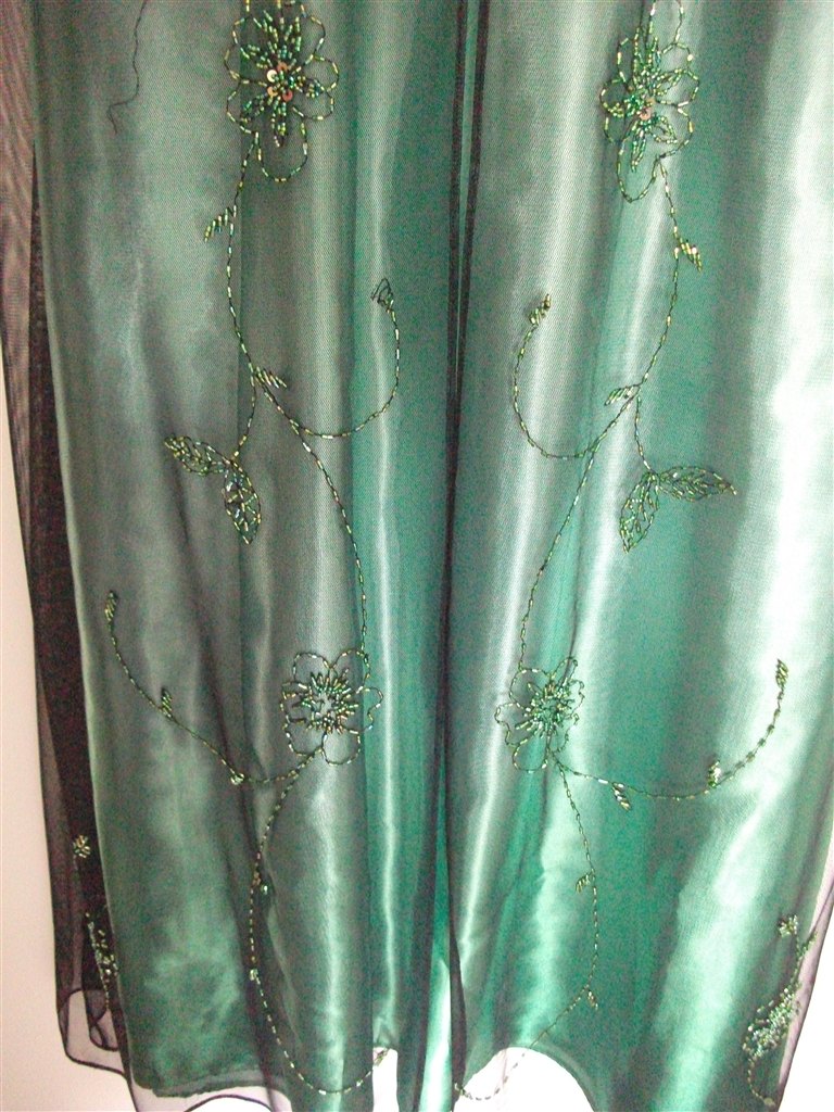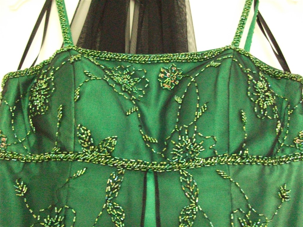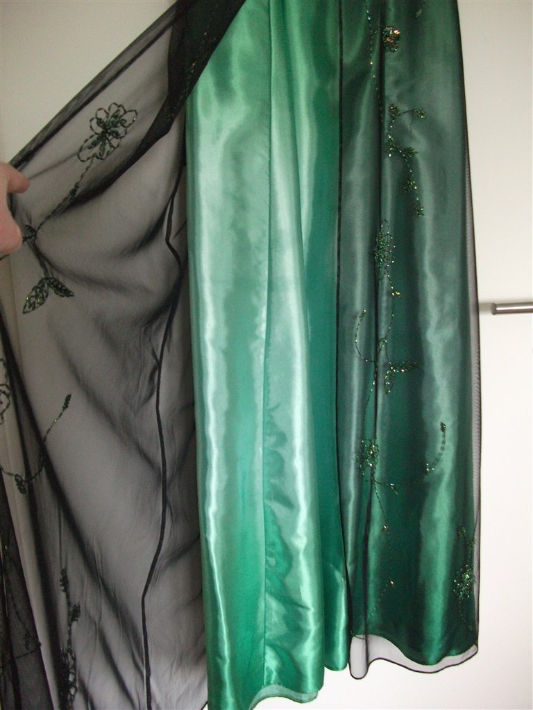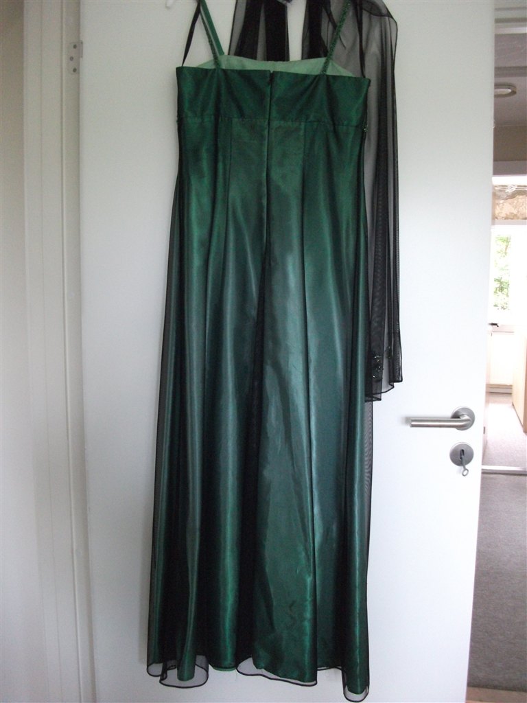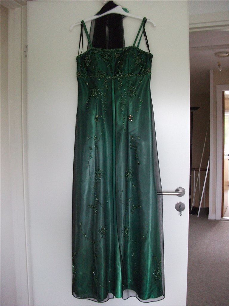 Den grønne er købt i Skott, og kostede 2200,- , det er en str. 38. Den er brugt en gang til bryllup, og renset bagefter.