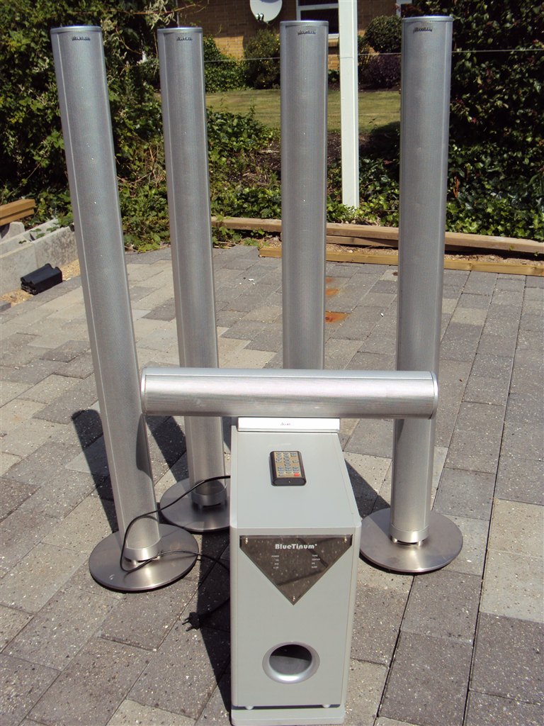 Består af 4 søjle højtalerer, en center højtale og styrings-kassen m. bass´en i og tilhørende fjernbetjening..