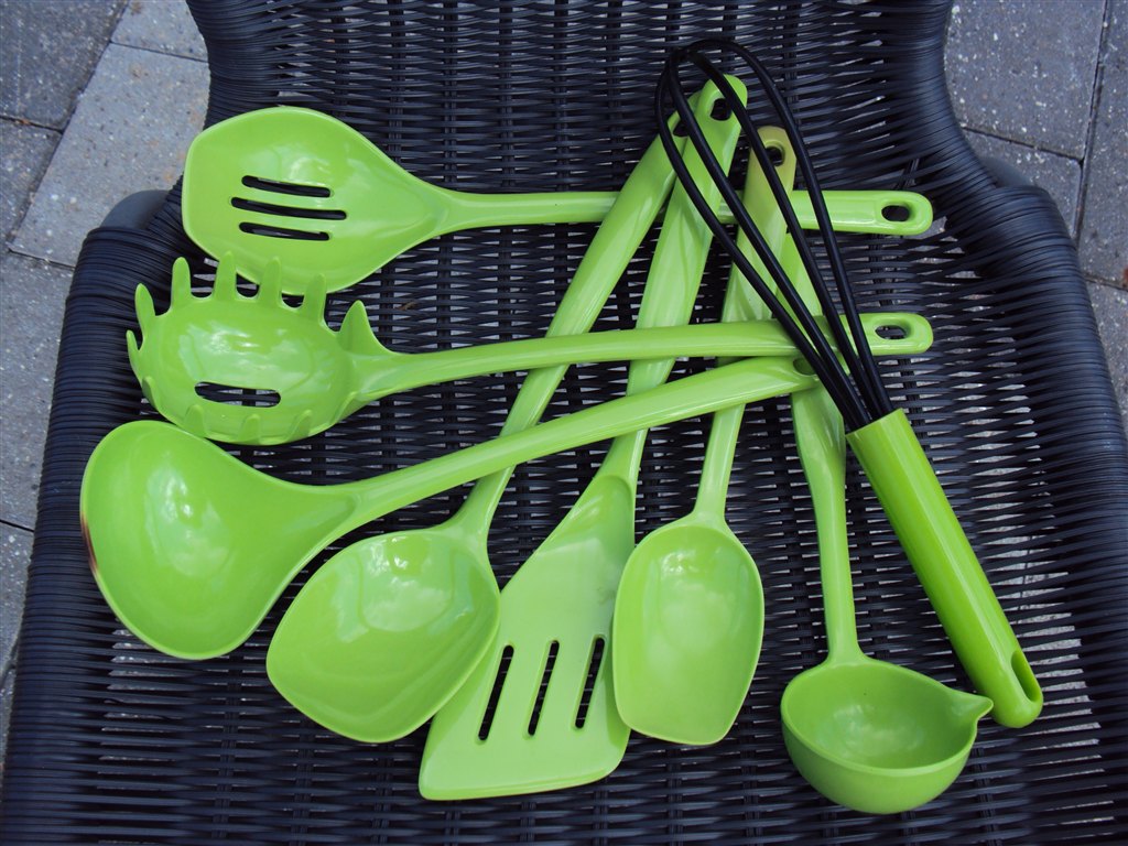 Et hel sæt køkken redskaber i melamin og en flot grøn farve (8 dele)