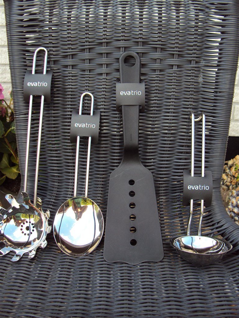 Eva Trio køkken redskaber i stål og plast. Salat/pasta ske, serverings-ske, palet og øse-ske..