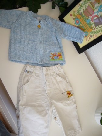 Billede 4: Disney sæt med Peter Plys, Sand farvet bukser, lyseblå cardikan med lynlås - størrelse 62