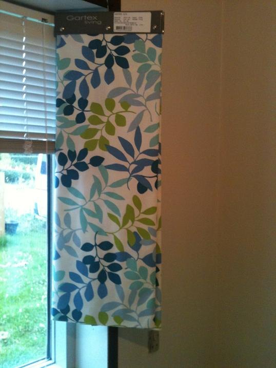 Billede 1: Det er altså ikke gardinet, men det ender med at blive forhænget til et intermistisk skab, som skal bygges fra vinduet hen til kommoden. Her bag kommer der 4 hylder til fx ekstra bleer og skumklude, der har været på tilbud osv. Og en bøjlestang til jakker, skjorter og andet.