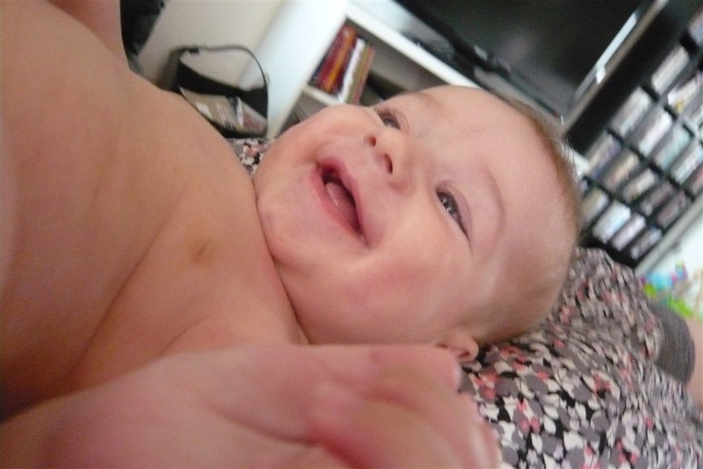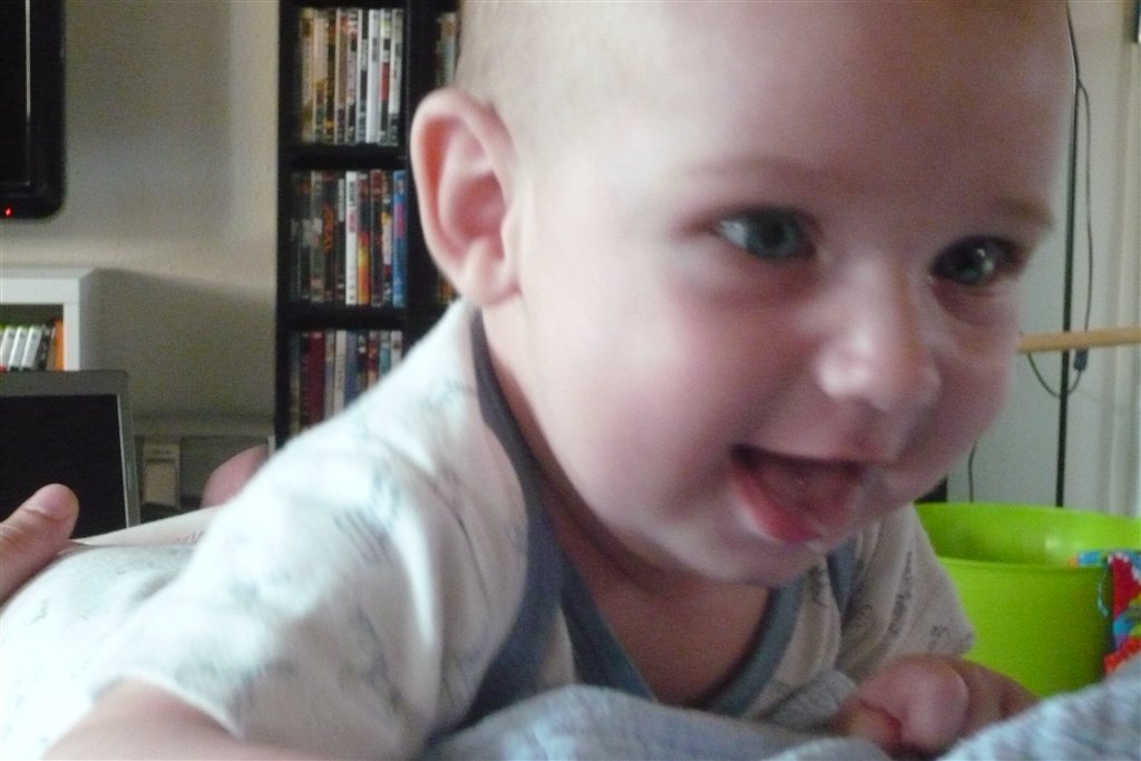 Han er lige blevet færdig med 19 ugers springet - oh my! han var billigt til salg i den uge det stod på! Nåh, men nu er han jo bare min skønne basse igen, som sover på sit eget værelse, flytter legetøj fra hånd til hånd, putter det i munden - ligesom alt andet inden for rækkevidde, har fået øje på sine tæer (kan dog ikke fange dem selv endnu), hviner så højt at han forskrækker sig selv, lukker læberne sammen og puster luft ud (DÉT er sjovt!!), får vælling og smagsprøver på risgrød, og holder sig så rank når han sidder. Han støtter fra på benene, følger os og alt andet med øjnene, genkender tydeligt far og mig, både stemmer og udseeende, øver sig i at trille og kan næsten fra mave til ryg.