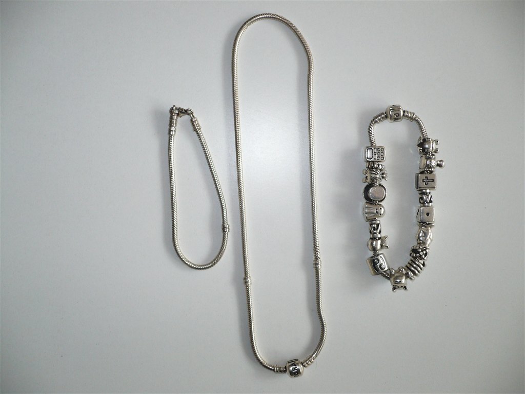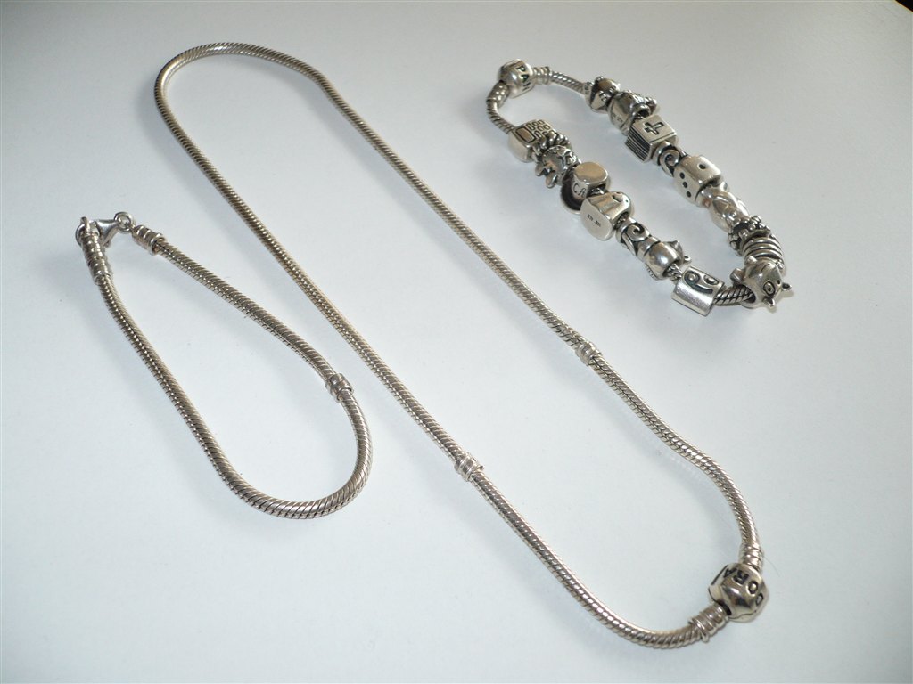 Pandora sættet har jeg gået meget med, men fejler intet, der er en halskæde, og to armbånd hvor det ene armbånd er med en almindelig lukkemetode, sælges da jeg synes de det synd de ikke bliver brugt mere.