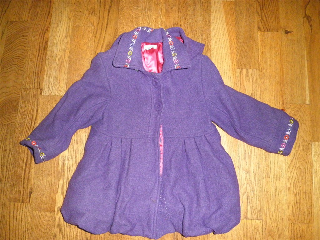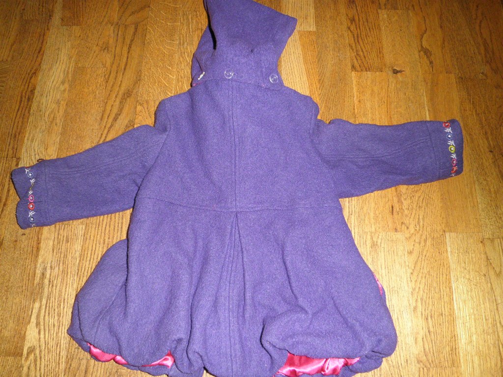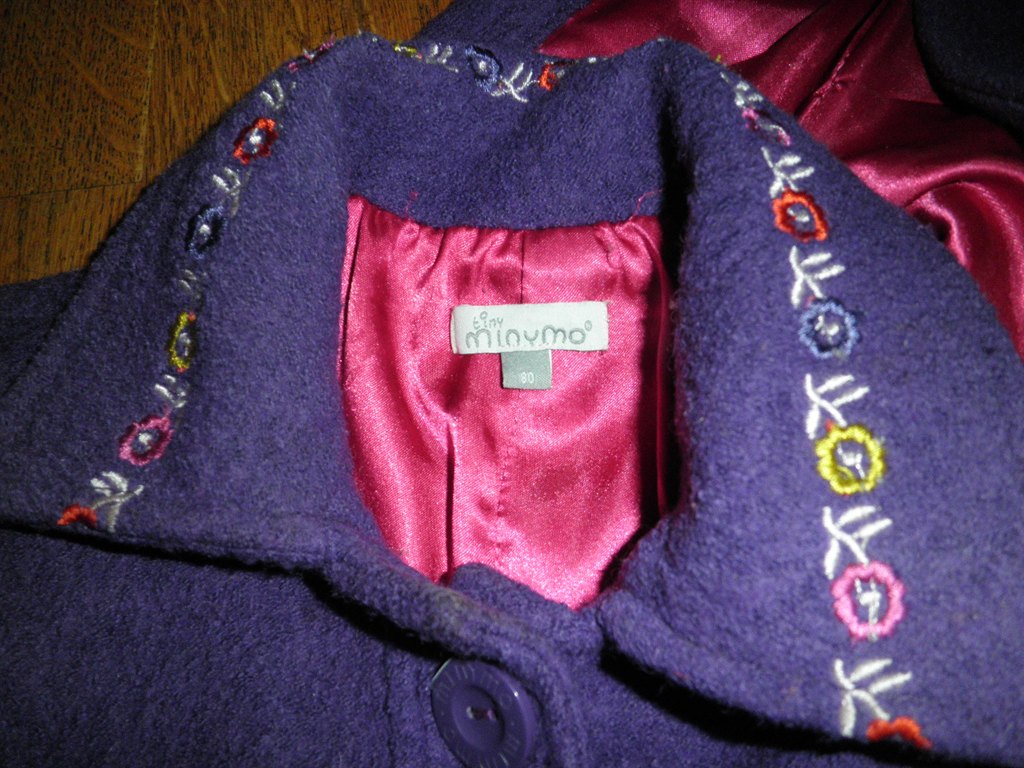 Velholdt frakke med balloneffekt fra Minymo. Hatten kan knappes af. Den er af uld og har knapper foran. Det er en str 80, men stor i det.