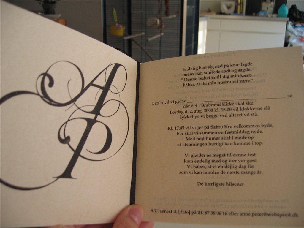 Vi tog på bryllupsmese og så en masse forskellige der. Du får lige et par billeder... Vi brugte så samme stil i vores bordkort. Også lavede vi selv et kirkeblad af samme papir som indlæget i indbydelsen.