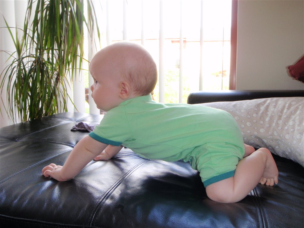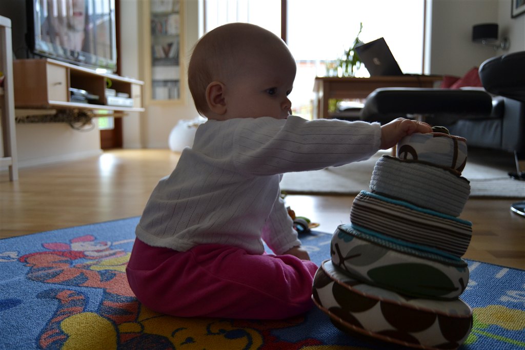 Motorisk vil jeg mene, at hun er meget godt med. Hun møver sig rundt og kommer fremad. Hun bruger næsten al vågen tid på maven. Hun kan sidde selv, hvis man lige er tæt på og kan gribe hende. Hun kommer op på alle fire og rokker. Tror desværre ikke der går lang tid før hun kravler og jeg skal rende rundt efter hende – Crist! Hvor blev min lille baby af????