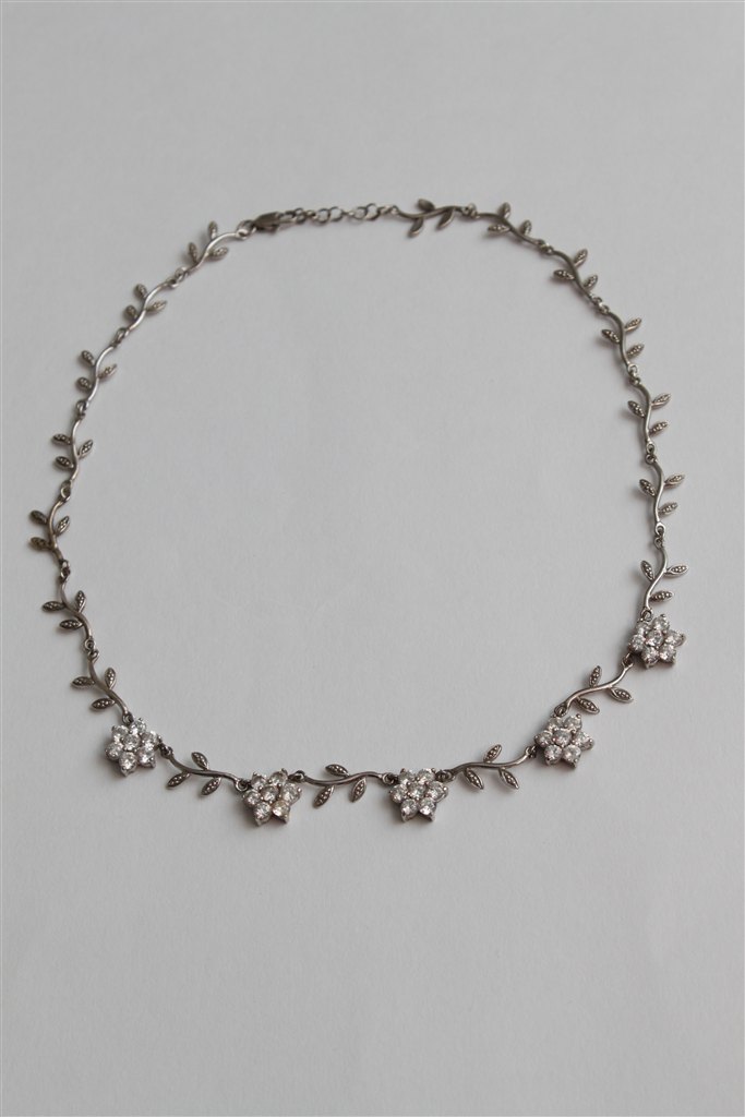 Billede 1: Smuk smuk Halskæde i sølv med små sten i blomsterne, ALLE sten er der.