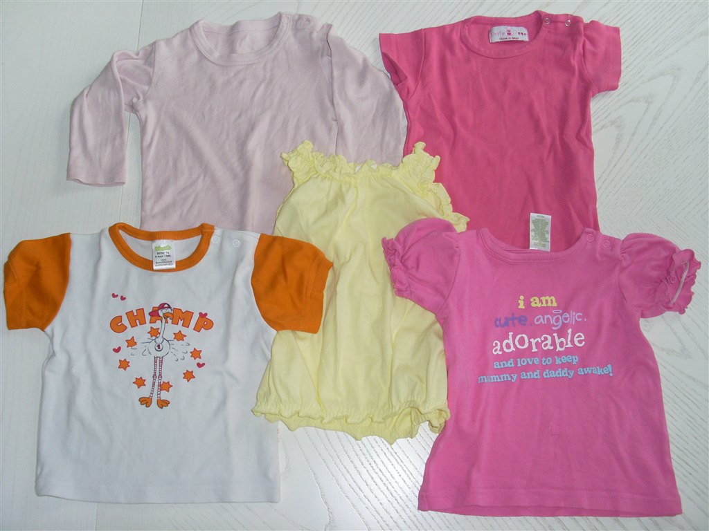 billed 3: lyserød lang ærmet bluse str. 80 (brugt 1 gang), pink t-shirt str 74, gul top str 74 (aldrig brugt men vasket), orange/hvid t-shirt str 74, pink t-shirt med skrift str 74 (aldrig brugt men vasket)