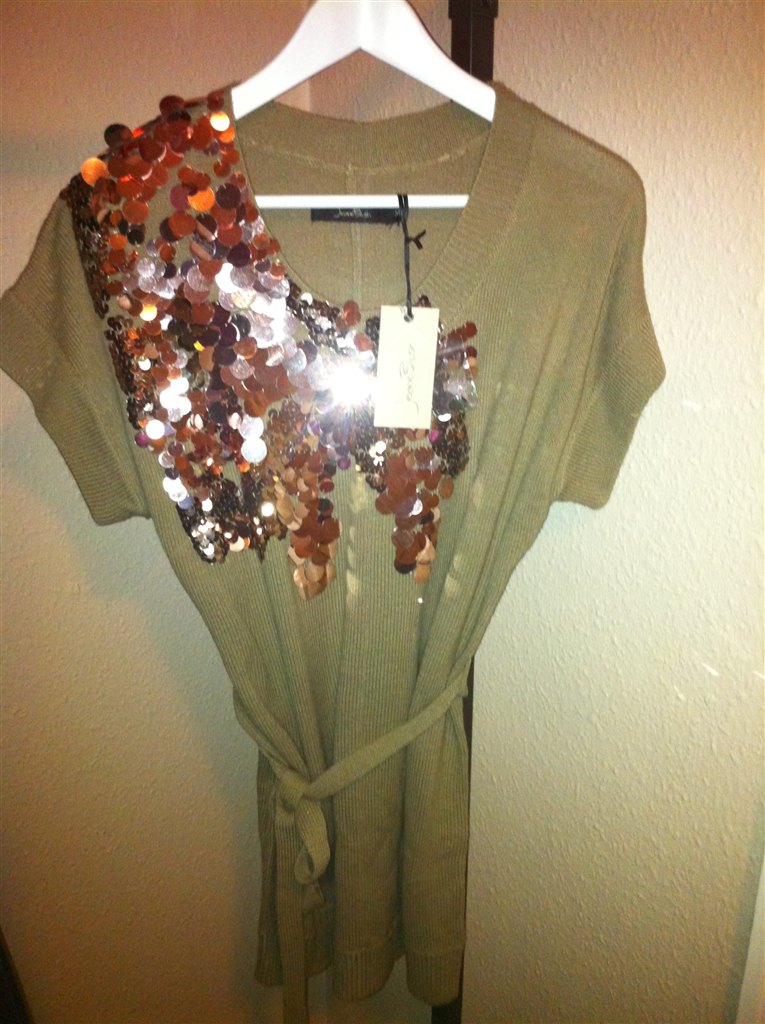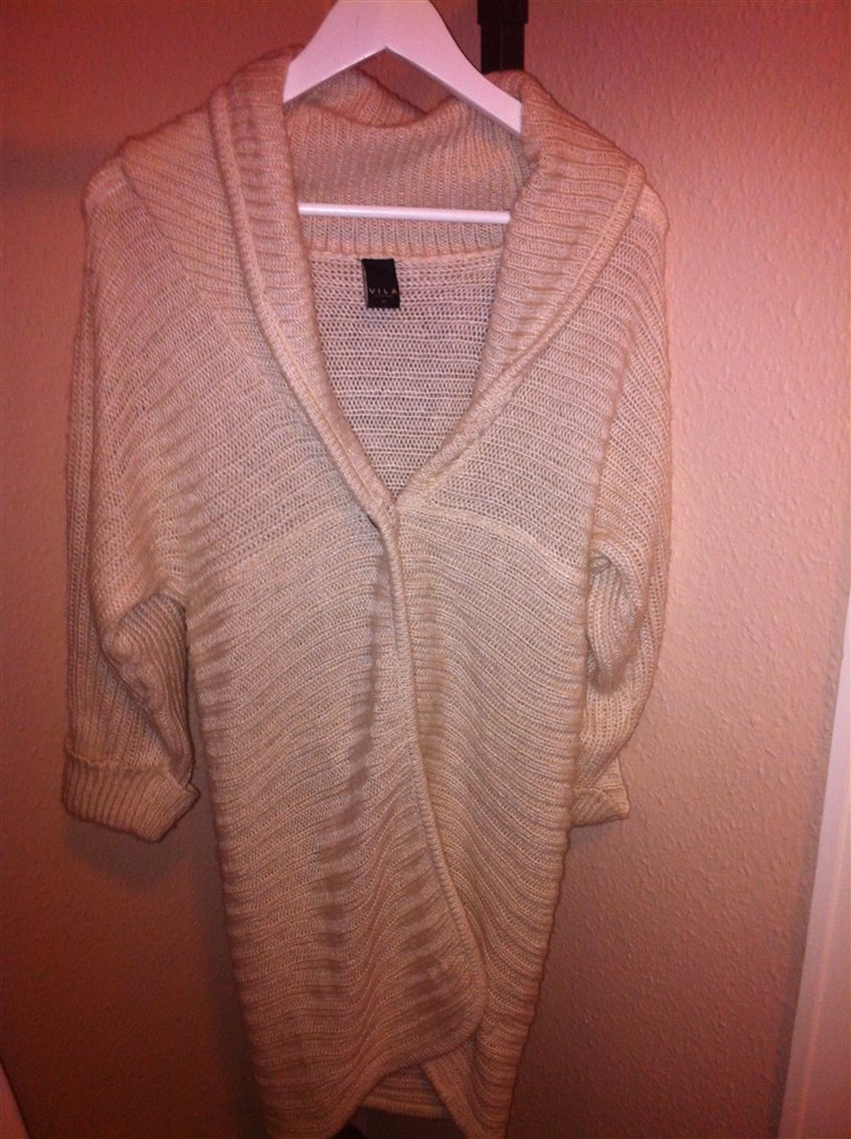 Og hvor lang er cardiganen og er den beige eller råhvid ? Pris ?