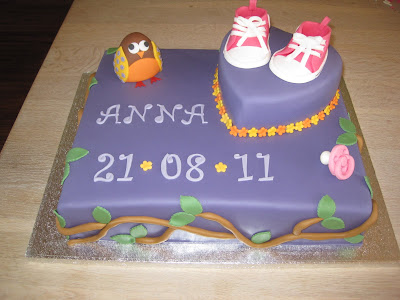 Drømmekagebunde, rabarbermousse og hvid chokoladecreme. Smurt op med PSC og pyntet med fondant.