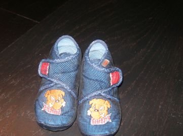1 par sutsko i str. 20, mørkeblå med en hund, med velcrolukning. Nogle dejlige behagelige sutsko når de begynder at gå. Nypris 99,-. Prisidé 25,-.