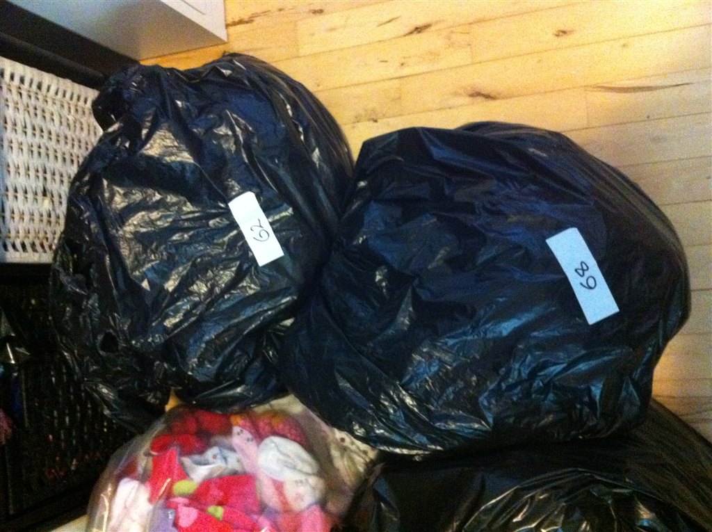 På billederne ses de forskellige sække - der er en sæk med 62, en med 68, en med 74 og en med 80