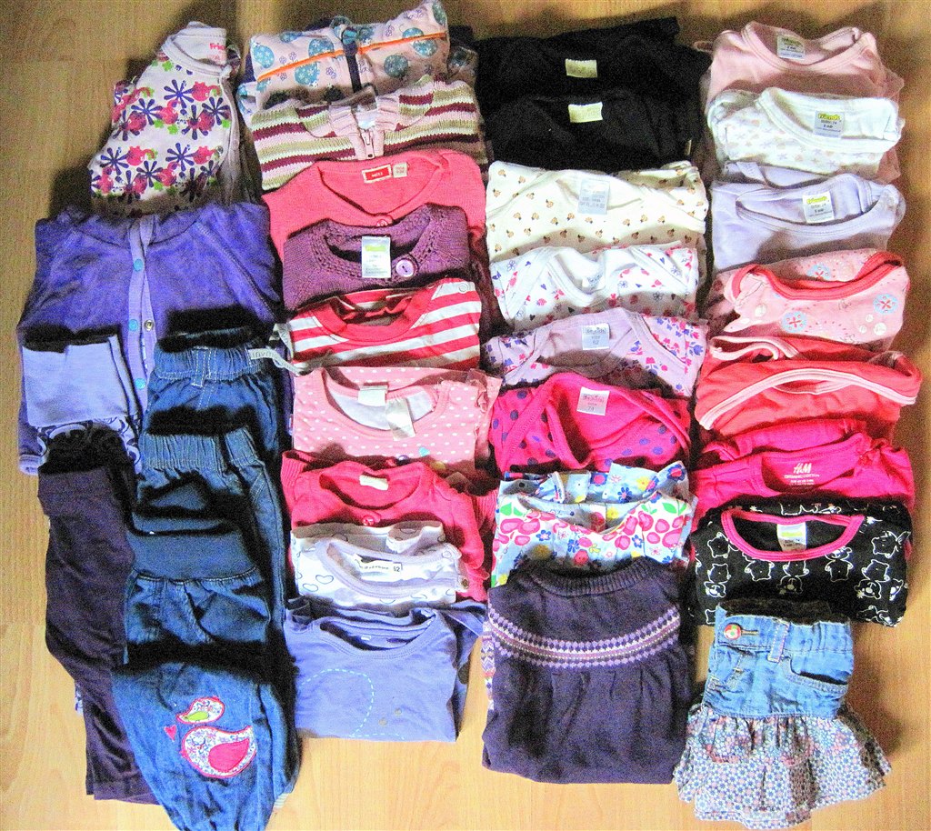 Der er: 2 kjoler, 1 nederdel, 7 langærmede bodyer, 6 kortærmede bodyer, 9 bluser, 5 par bukser, 1 natdragt, 1 fleecejakke.