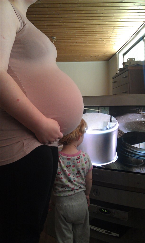 Mira0911 skriver: Må sige at maven har ikke samme pæne form som for en 1 måned siden... Sunket godt ned... Det betyder også at jeg slet ikke sidder særlig godt i sofaen i mere om jeg sidder på dyner eller tæpper, kan være lige meget... Men som sagt, det er jo snart over... Render oppe om natten alt for mange gange.. Hihi... Blæren er temmelig presset om natten... Plus halsbranden også driller, der skal jeg også op 2 gange om natten for at tage gaviscon... Glæder mig til at slippe af med alt det... Og nyde tøsen... Kysse og kramme hende... Sammen med min skønne lille familie... De der mens smerter, nøøøj de driller... Så man tror der er noget optakt til et eller andet, men nej, de forsvinder igen efter en lille time... Vægten siger nu +28 kg... Jeg er SÅ klar til at føde.. Hun kan bare komme... Går og venter tålmodigt, så meget som man nu kan... Så er der end masse gætterier i min familie... De fleste tror hun melder sin ankomst på min fødselsdag... Her er et frisk billede....