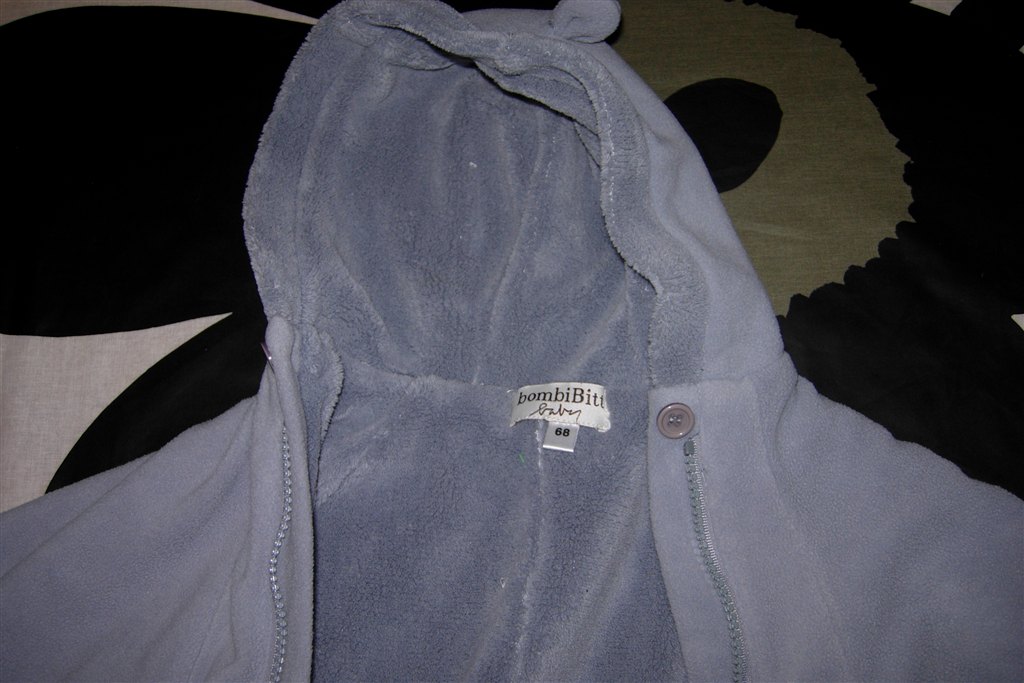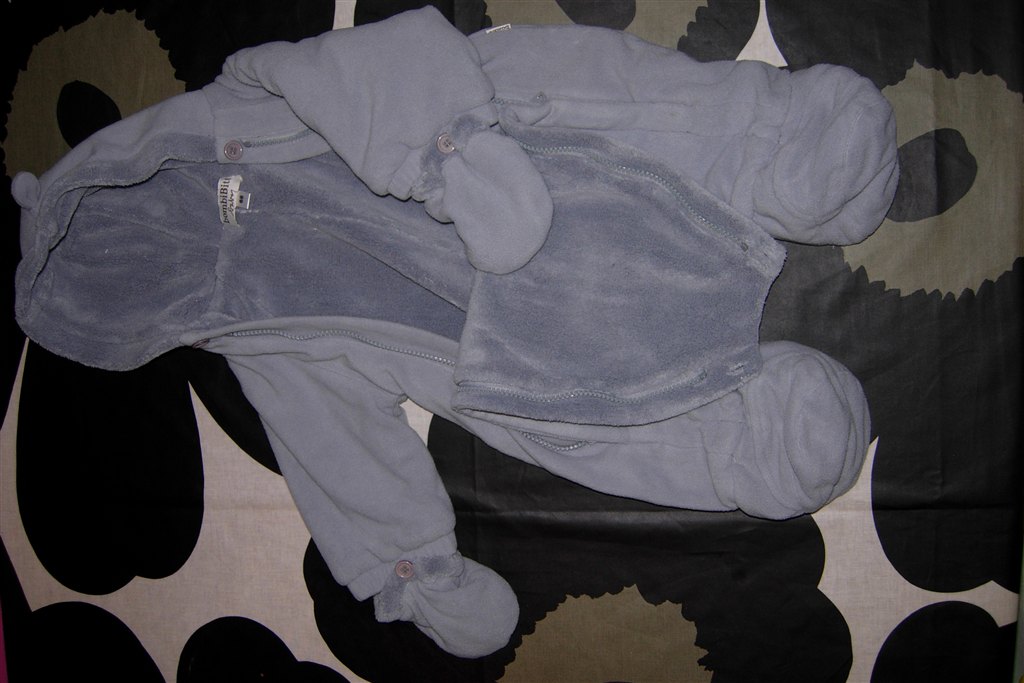 Gråblå bombiBitt fleecedragt str. 68, med to lynlåse der kan lynes ned i benene, vanter der kan knappes af. Den er lækker blød og varm. Brugt få gange.Vasket to gange. BYD.