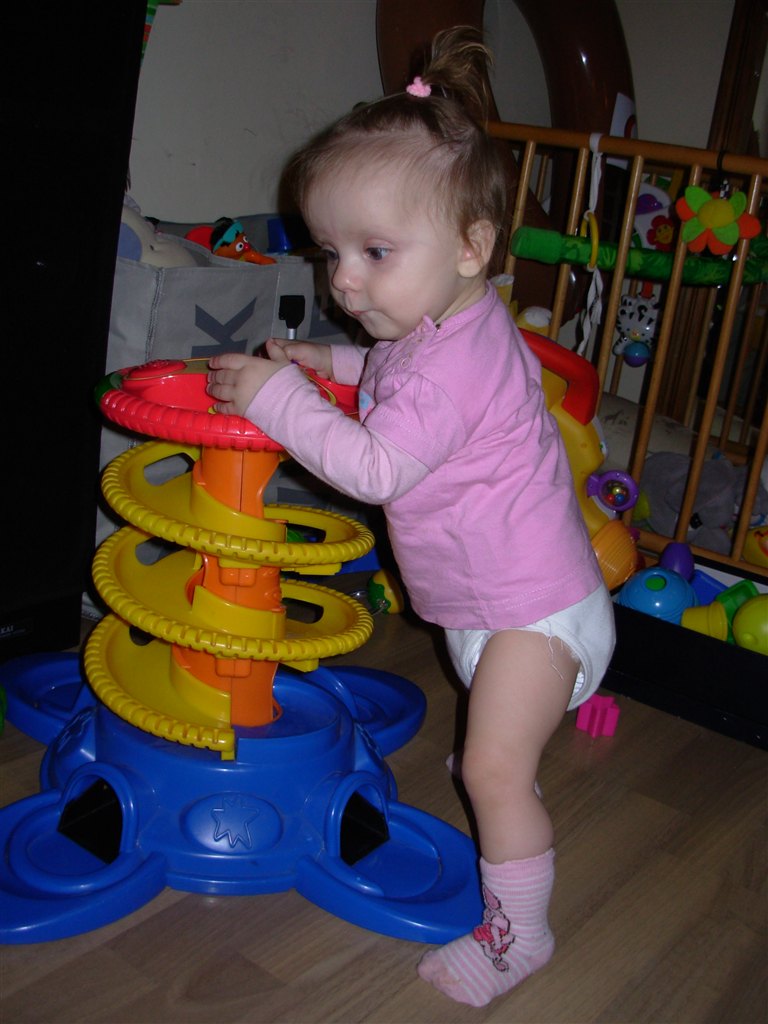 Hun syntes alt andet end babylegetøj var/er sjovt. Jeg har engang haft en papkasse stående inde i min stue (pynter riiiigtig meget i en 2værelses! høhø) fordi den var bare et hit at stå op af, og klappe på med hænderne. Til sidst da hun blev mere og mere mobil, fandt hun også ud af hun kunne kravle derop og sidde ...