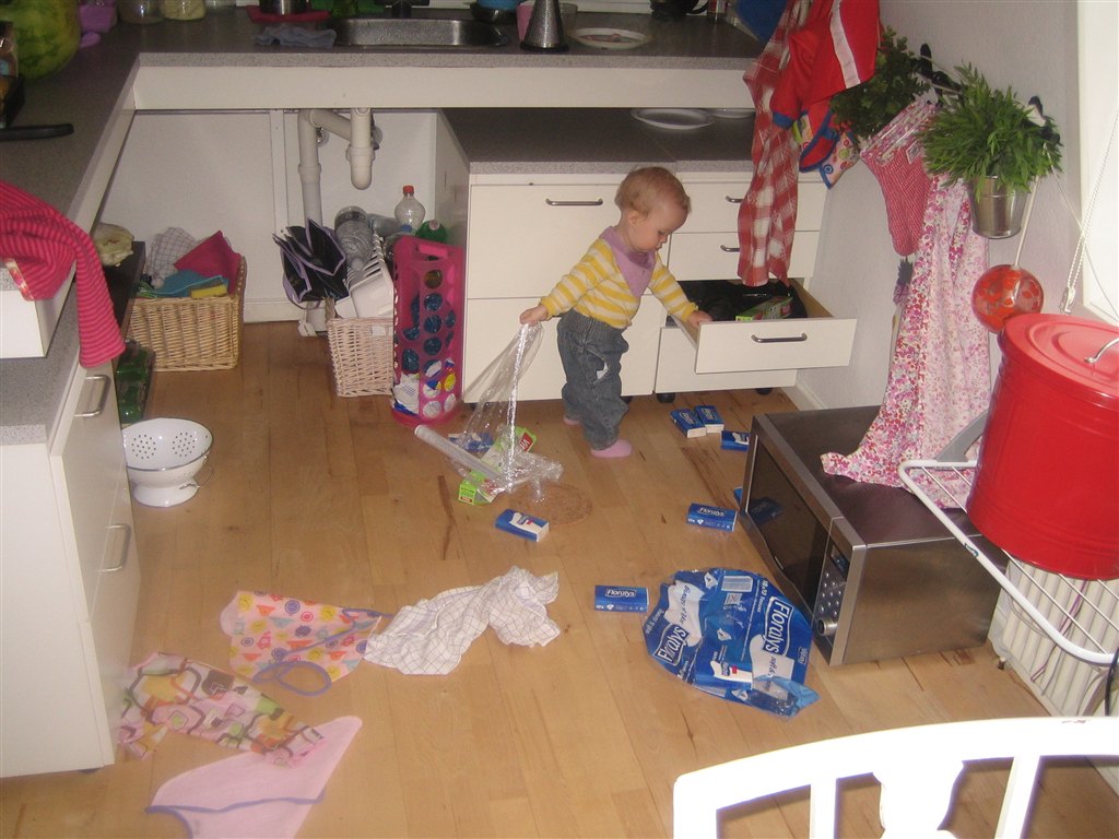 Ellers så er det også et hit at lege ude på badeværelset, for der har moar alle mulige kasser som kan tømmes! Eller i køkkenet ..