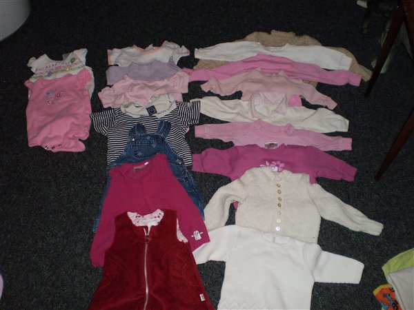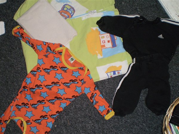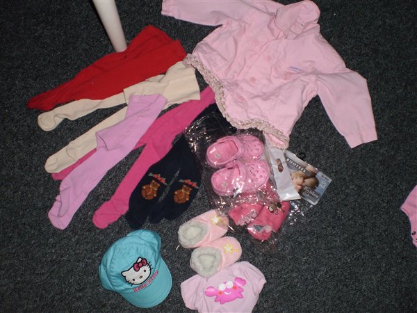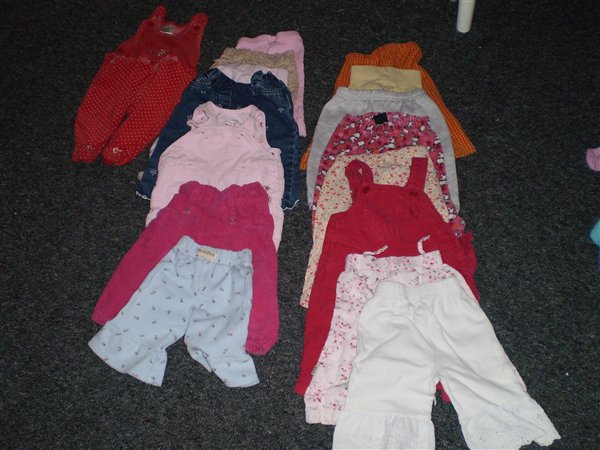 15 par bukser/2 med seler, 9 trøjer/bluser, 4 t.shirts, 3 kjoler, 2 bodyer, 1 pk. ny sutsko, 1 sparkedragt, 1 sæt adidas, 1 heldragt fra småfolk, 1 sommerjakke, 1 ny badebuks, 5 par strømpebukser, 1 kasket, et par hjemmefutter og sengetøj plus skifte/tisselagen.