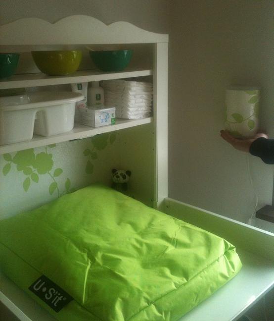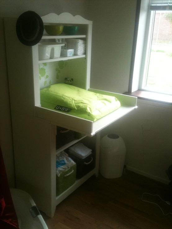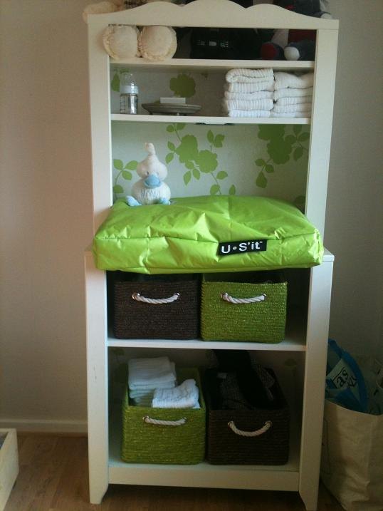 Det eneste, jeg har gjort, er at skaffe en hel og lidt tykkere plade som bagbeklædning til puslereolen. Det gør hele reolen lidt mere stabil og det er nemmere at tapetsere på én plade end de 4 små.