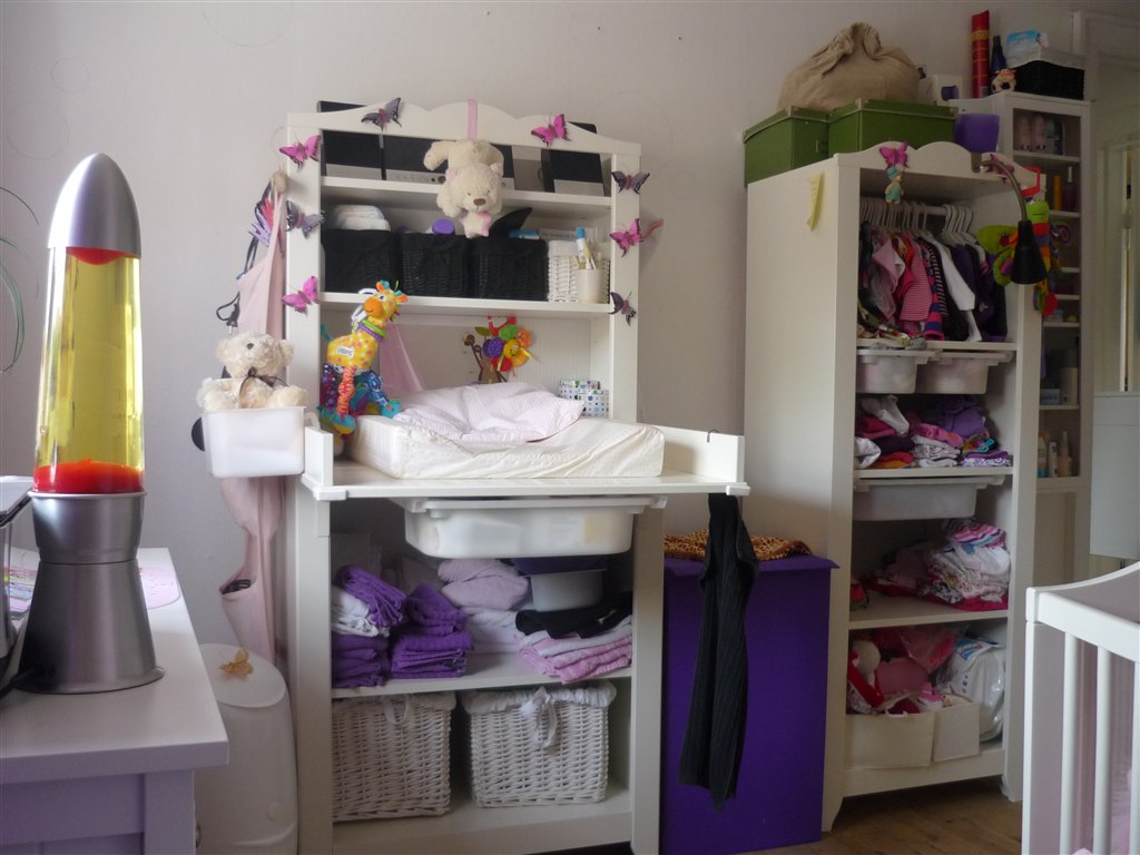 Jeg har et billede, som er fra inden vi flyttede, så det hele ser lidt rodet ud, men der kan du se at jeg har pyntet det med sommerfugle, sat en skuffe under puslepladen, til cremer, servietter osv. Og så et spejl, som min datter forøvrigt var rigtig glad for da hun var baby. OG den dag i dag er hun ENDNU mere glad for det, når hun lægger og fjoller på puslebordet, synes hun det er noget er så fedt at kigge sig selv i spejlet imens