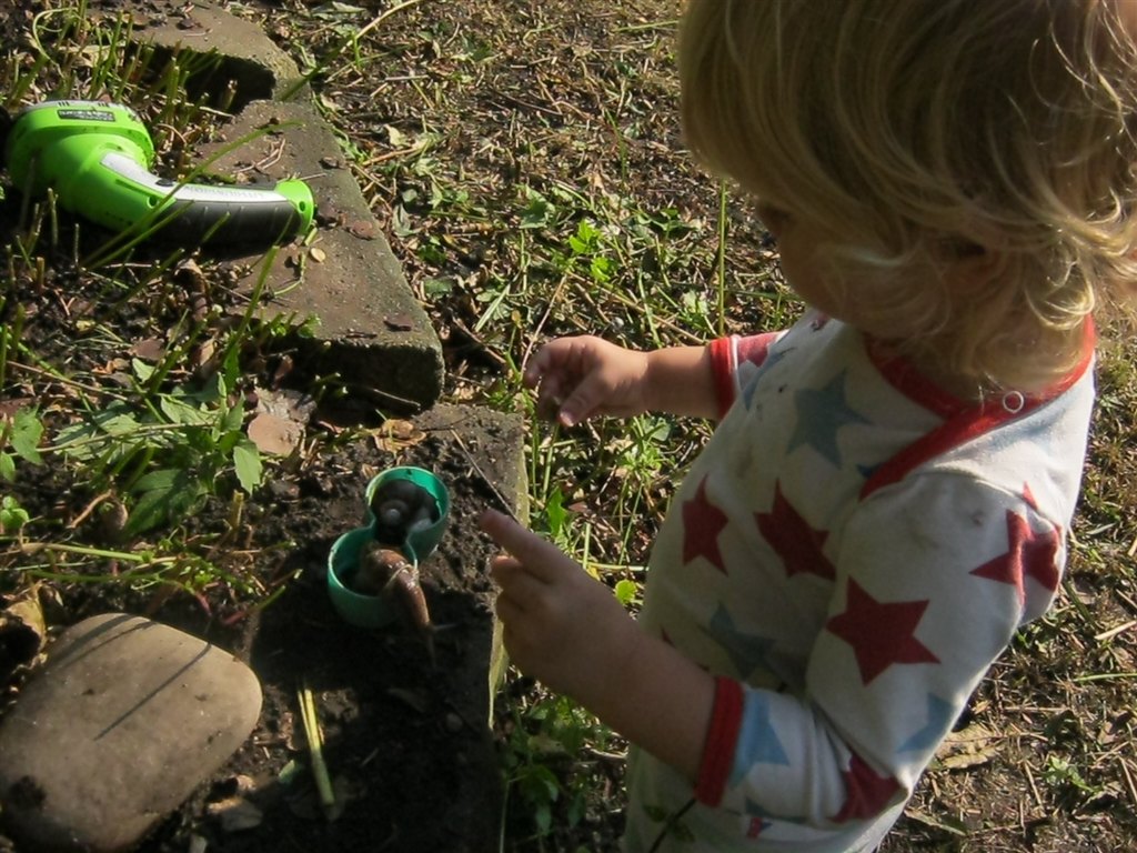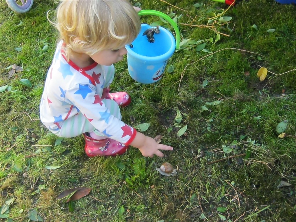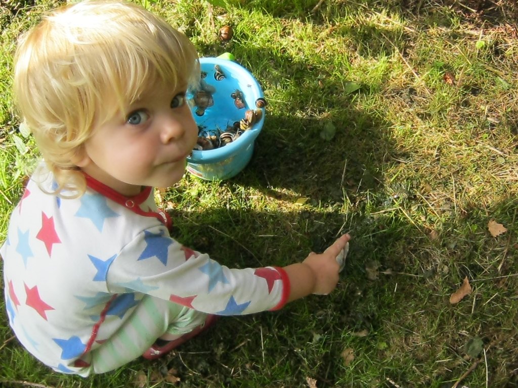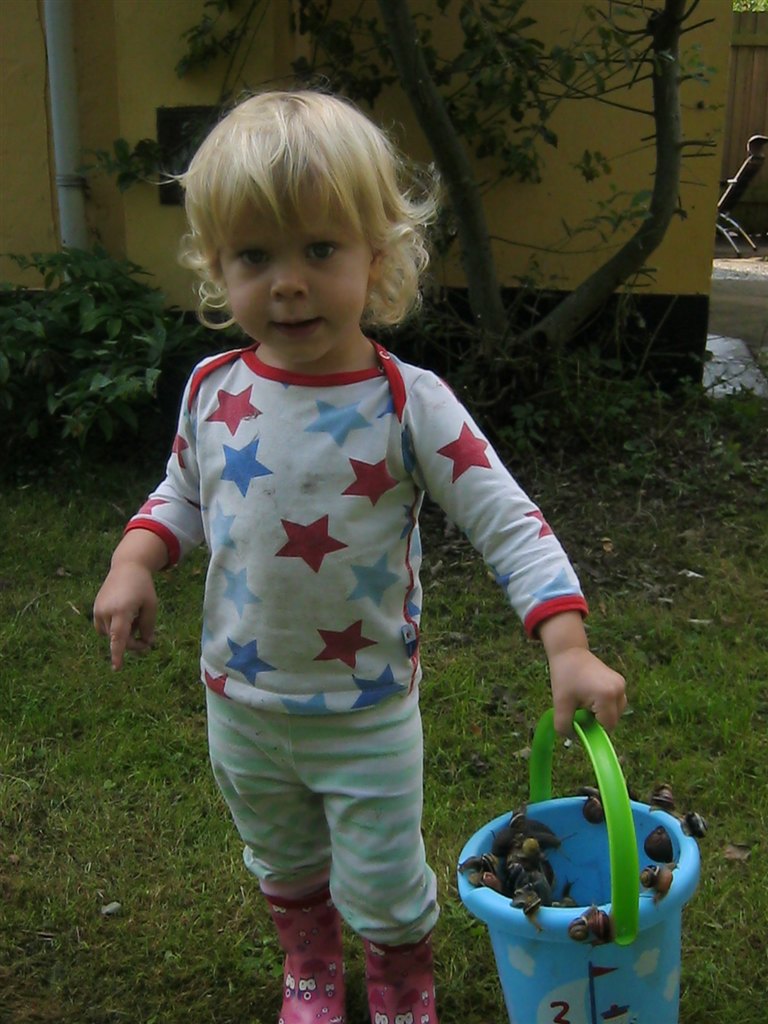 ja jeg glemmer jo lidt at lægge billeder ind af ungerne, men her får i så lige Tinke på mega snegle jagt i haven i formiddags
