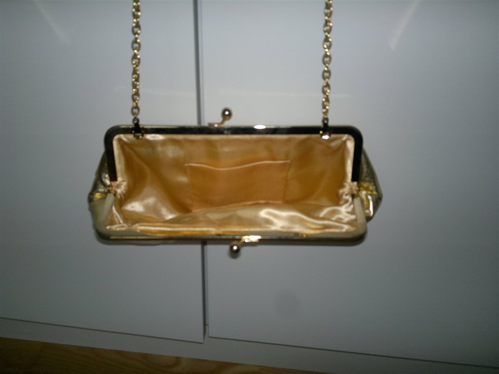 Guld Clutch, med skulderrem aldrig brugt, mærke ukendt. 100 kr
