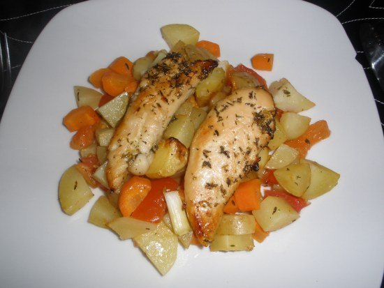 Jamen det er kylling og grøntsager bagt i ovn. Grøntsagerne er gulerod, kartoffel, tomat og forårsløg. Og så inden kyllingen kommer i ovnen skal den lige marinere i et par timer i en marinade bestående af honning, olivenolie, citronsaft, timian, salt, peber og hvidløg. og så hældes lidt af marinaden over grøntsagerne også, inden de kommer i ovnen. Namme nam!