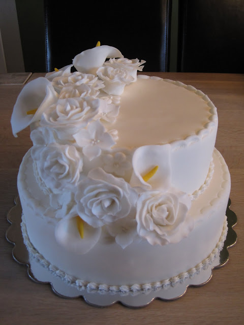 Hvid kagedummie. Denne gang for at vise lidt bryllupskagetema og Callaliljer samt småblomster:-)
