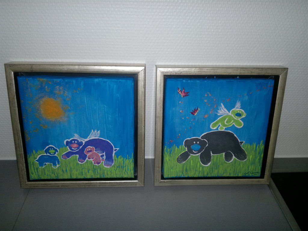 Har to fine malerier i svæveramme, rigtig søde til børneværelset..