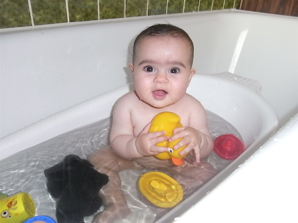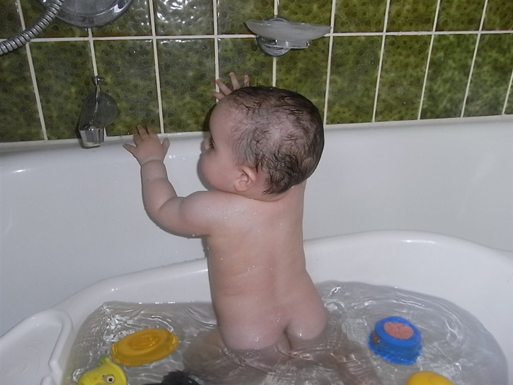 . Hun lå så inde i brusenichen og legede med shampoo-flasker, så hun var blevet pladdervåd på maven!