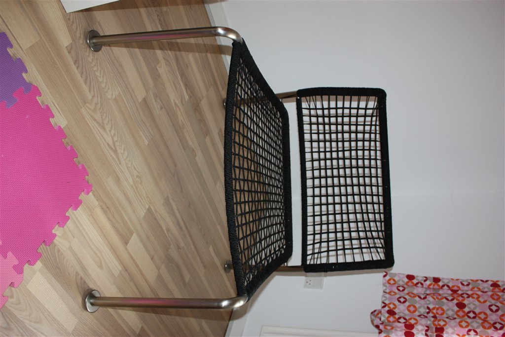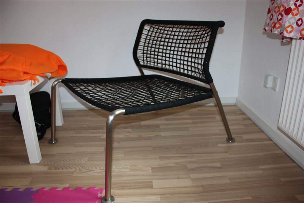 hopper stol. i børstet stål, med sort flette snor, lav lænestol, med stor siddeflade. skal afhentes