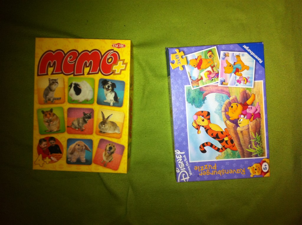Billed 1: Et memo spil og en pakke med 3 Peter plys pusle spil på 49 brikker.