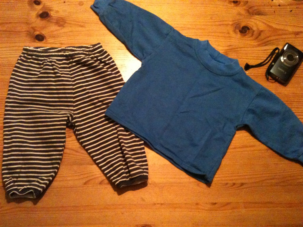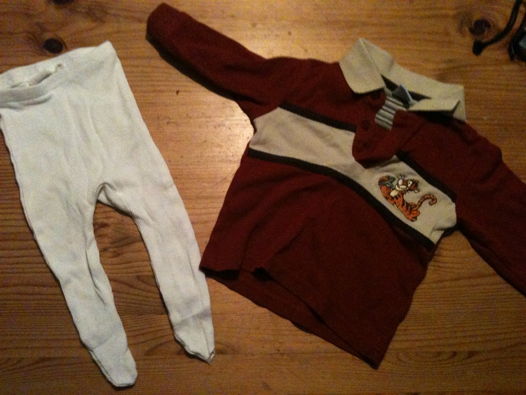 Trøjen på billede 2 er str. 74, og bukserne er str. 60, men bukserne svare til en str. 70, de er store i str.