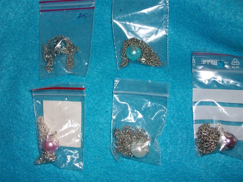 Billede 12: Kæder findes i guld og sølv med hvid eller mørk turkis perle.