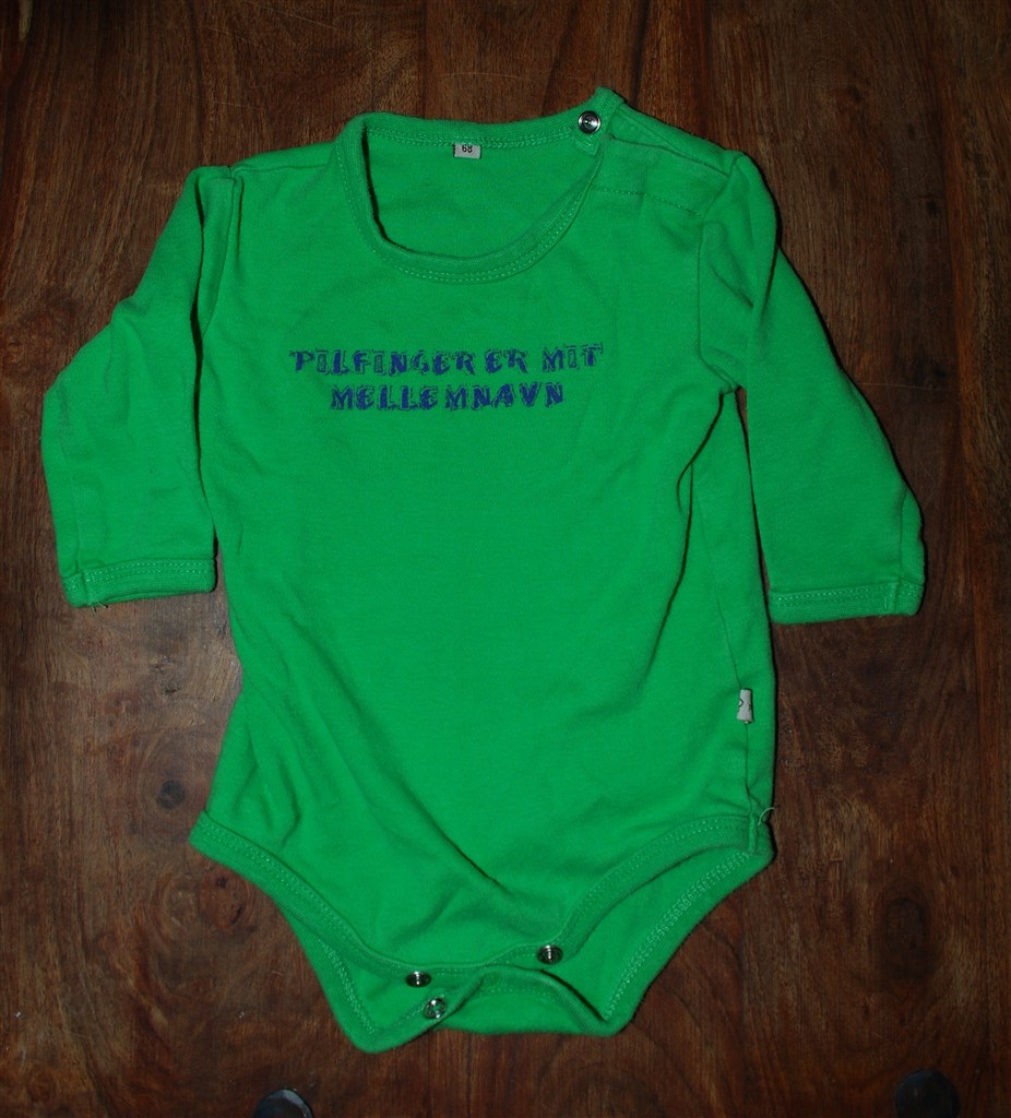 Billed 2: Grøn body med tekst "Pilfinger er mit mellemnavn". Ukendt mærke men købt i Kære børn. Brugt men god stand.