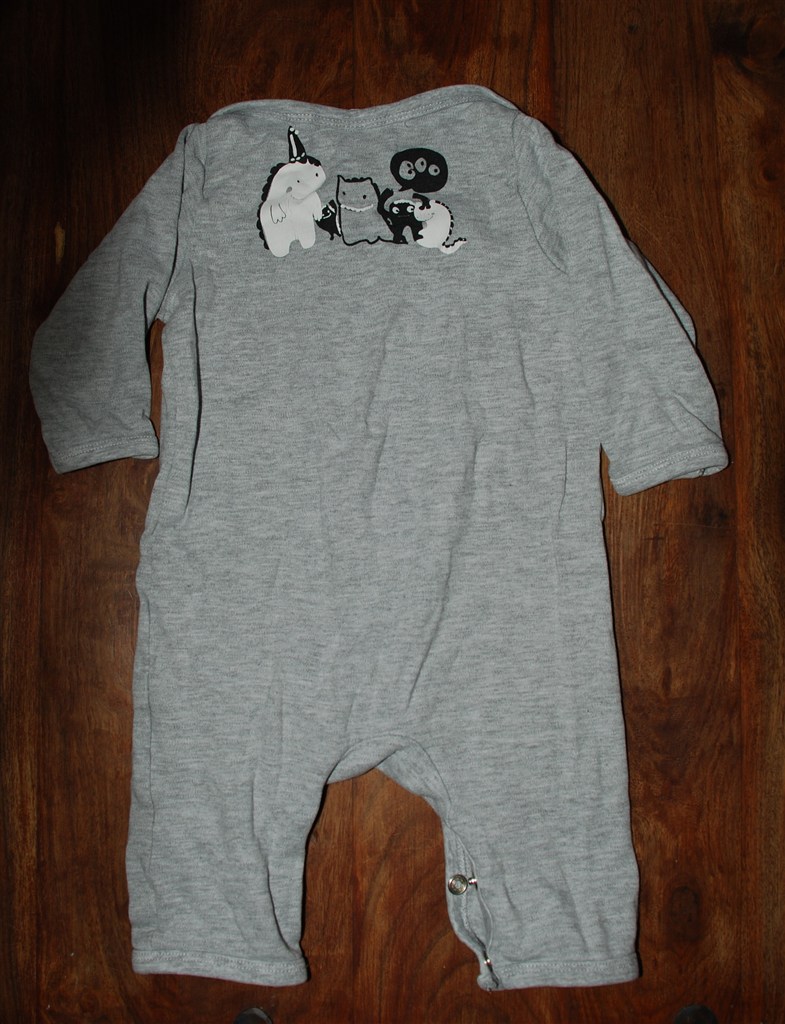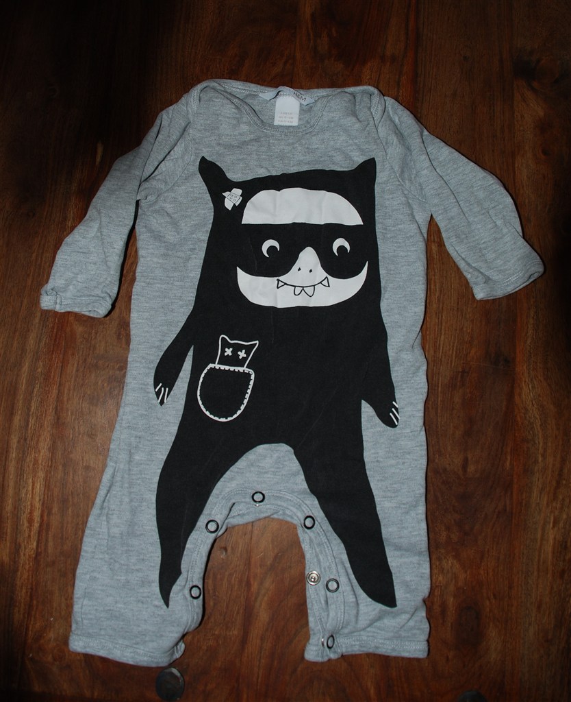 Billed 4+5: Grå dragt fra H&M med monster på. Billed 4 er forfra. Billed 5 er bagfra. Brugt få gange.