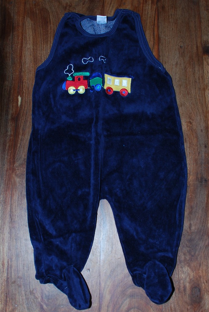 Billed 8: Dragt med fødder. Blå med tog på. Brugt men i god stand.