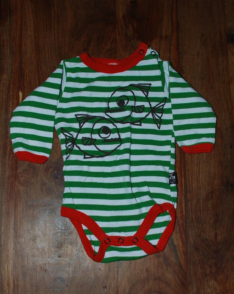 Billed 12: Grøn og hvid stribet body med rød kant. Piratfisk på maven. Mærke
