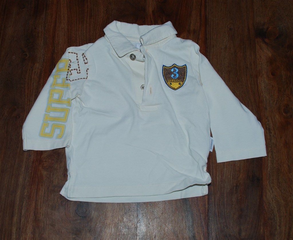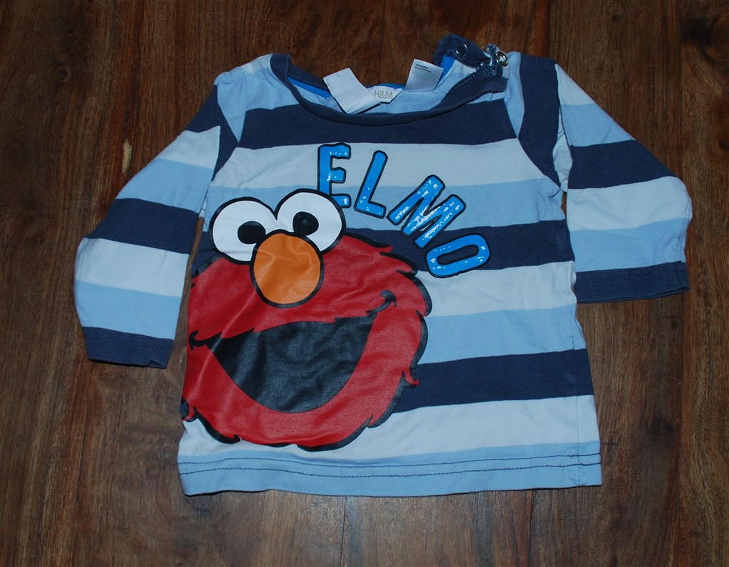 Billed 20: Hvid, mørkeblå og lyseblå stribet bluse med Elmo fra H&M. Brugt men i god stand.